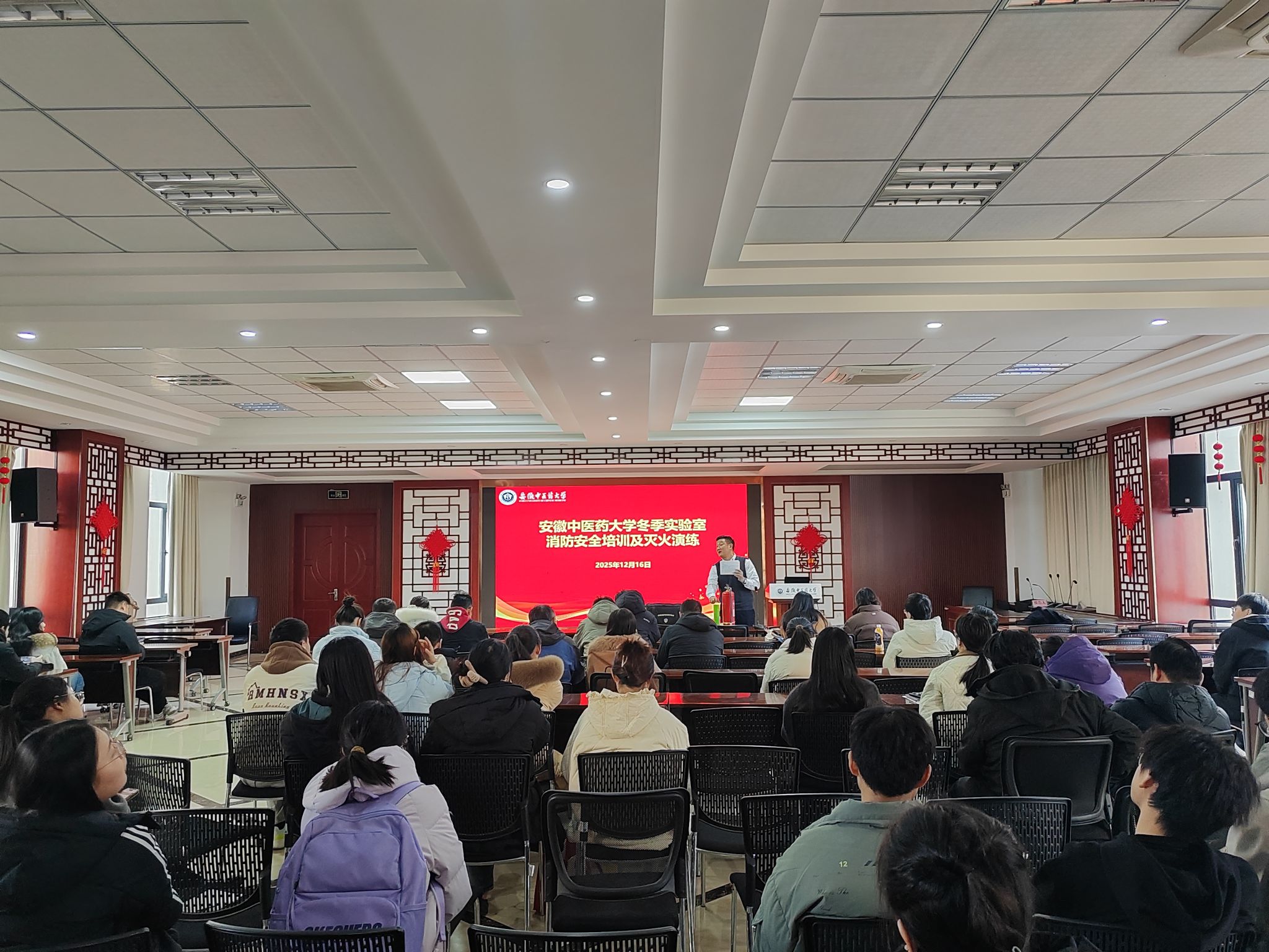 根据教育部《高等学校实验室安全检查项目表(2025年)》要求,加强实验室安全管理,提升实验室相关人员应对火灾突发事件的应急处置能力,保护学生和教职工的人身和财产安全。12月16日下午,邀请校保卫处的同志对实验室安全员们进行了消防知识培训,并进行了实地灭火演练。
